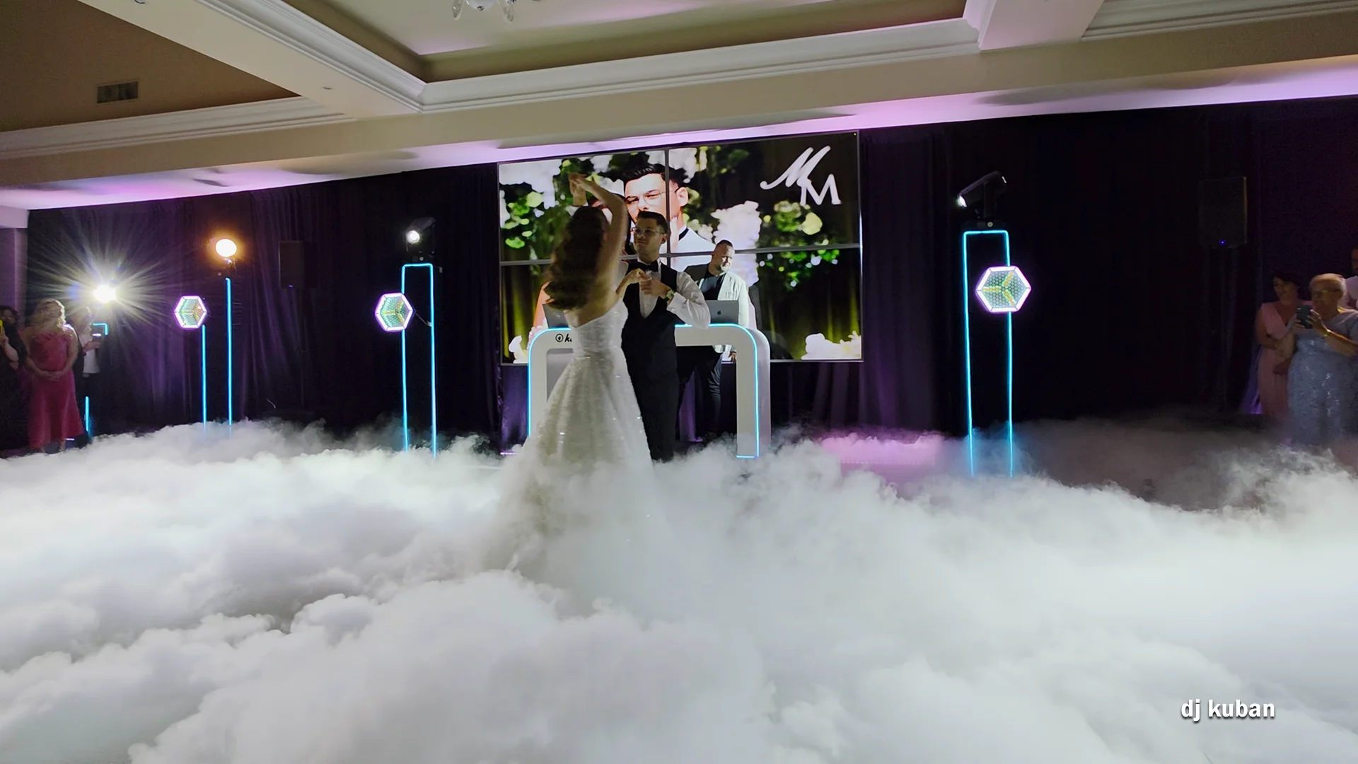 Zobacz, jak ciężki dym układa się nad parkietem i podkreśla pierwszy taniec oraz wybrane momenty wydarzenia.